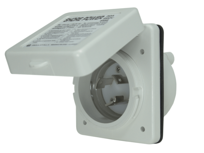 Wpuszczane gniazdo elektryczne przeznaczone do jachtów oraz kamperów. Wykonane z mocnego tworzywa.