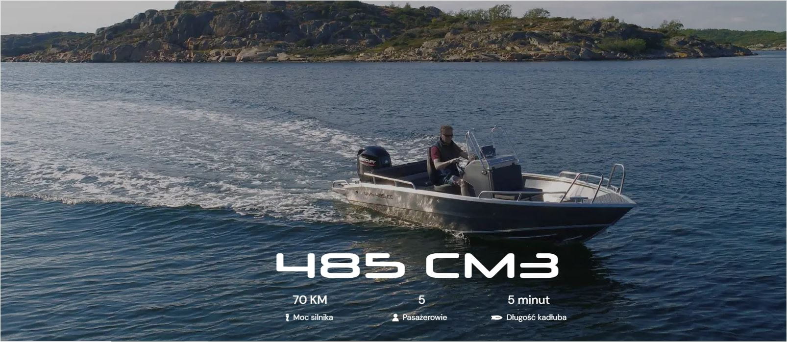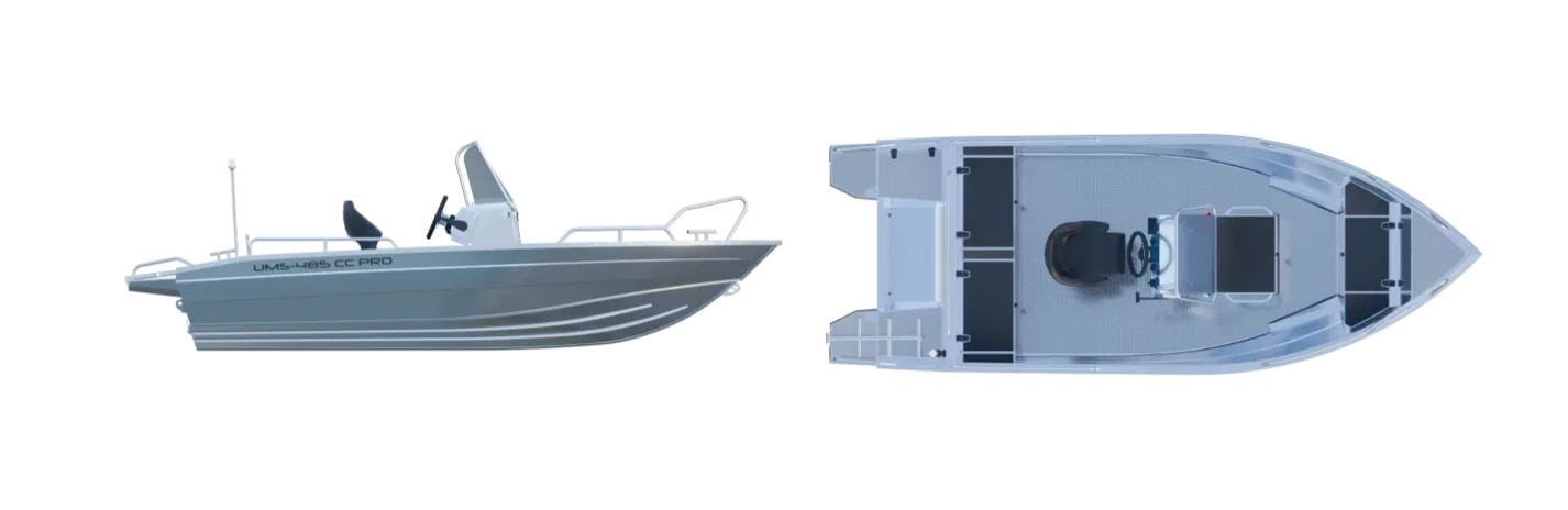 to łódź z centralną konsolą kierowcy. UMS 485 CC można nazwać bardzo popularnym, pomniejszonym modelem równie popularnej łodzi UMS 545CC, ponieważ mimo mniejszych wymiarów jest miejsca na niezbędne rzeczy. Konsola wykonana jest z tego samego stopu aluminium co cały kadłub. Na obwodzie oszklenia jest poręcz wykonana z rury. W przedniej części konsoli znajduje się pojemna szafka z pokrowcem na siedzenie. Przy mocy silnika 60 KM prędkość wynosi około 60km/g.