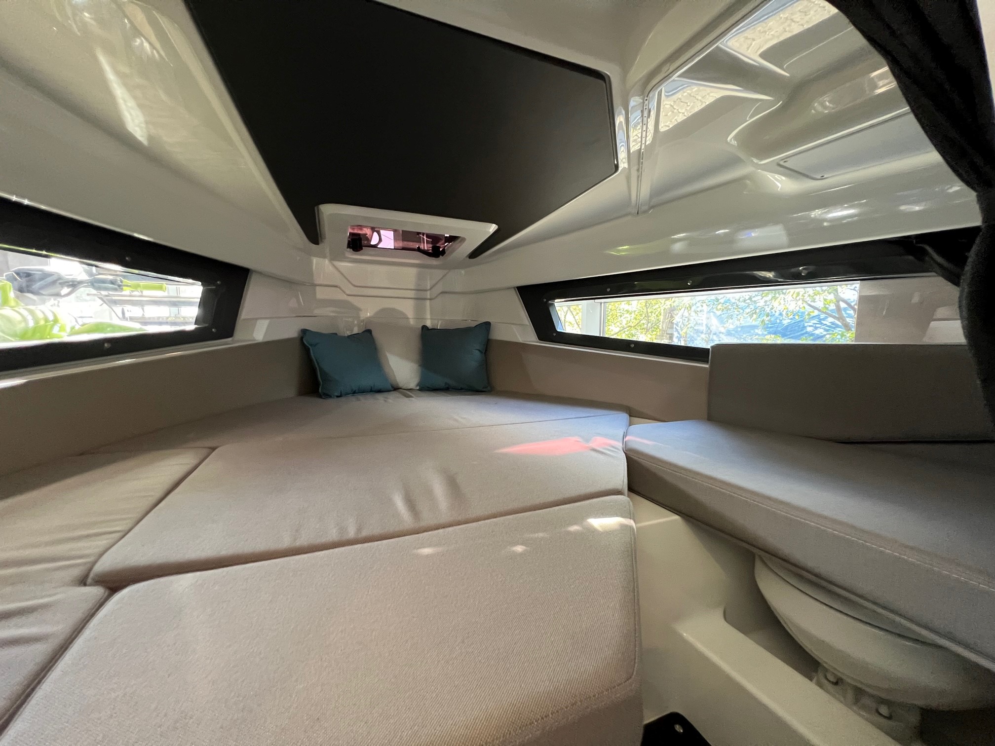 Jasna kabina z dużymi przeszkleniami i lukiem dachowym zapewnia wygodne miejsce do odpoczynku dla dwóch osób oraz praktyczną przestrzeń bagażową. Opcjonalne wyposażenie, takie jak toaleta czy moduł kuchenny, zwiększa komfort podczas dłuższych rejsów.