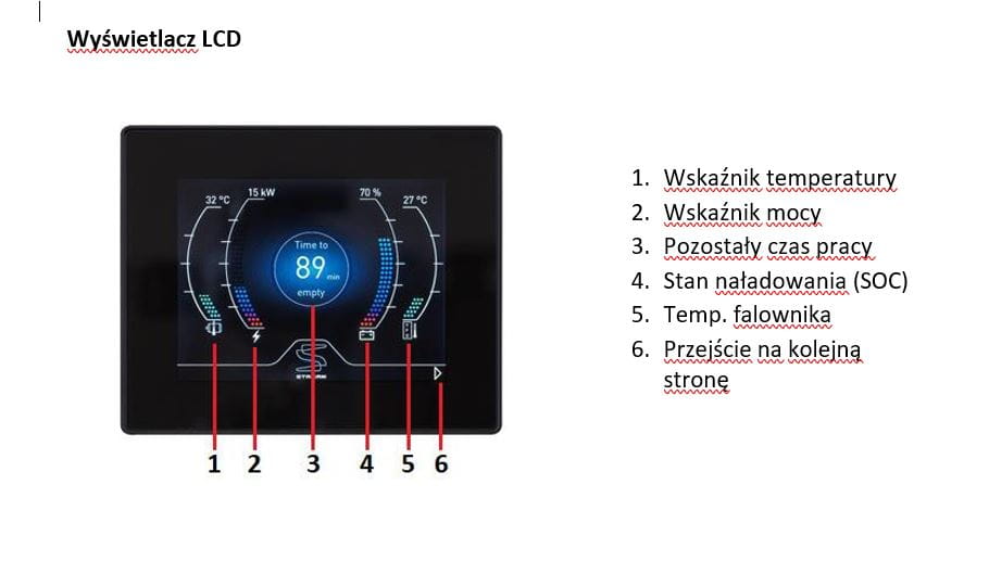 Wyświetlacz LCD do informacji i systemu kontroli – to panel sterowania, który pokazuje kluczowe informacje o pracy silnika, takie jak poziom naładowania akumulatora, prędkość, temperatura czy inne dane diagnostyczne. Umożliwia również sterowanie różnymi funkcjami silnika i monitorowanie jego stanu w czasie rzeczywistym.